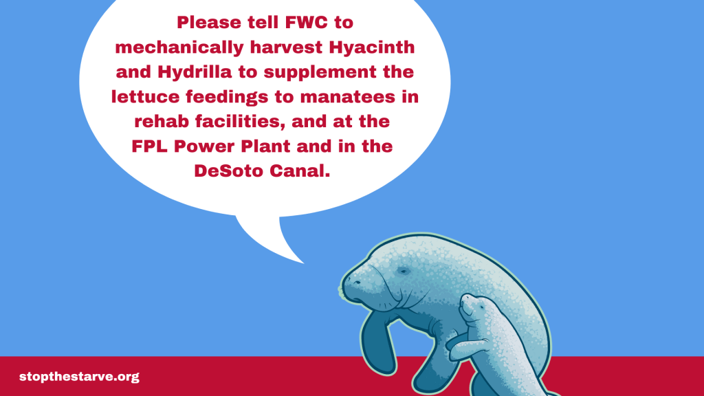 Please tell FWC to mechanically harvest Hyacinth and Hydrilla to supplement the lettuce feedings to manatees in rehab facilities, at the FPL power plant and in the DeSoto Canal.